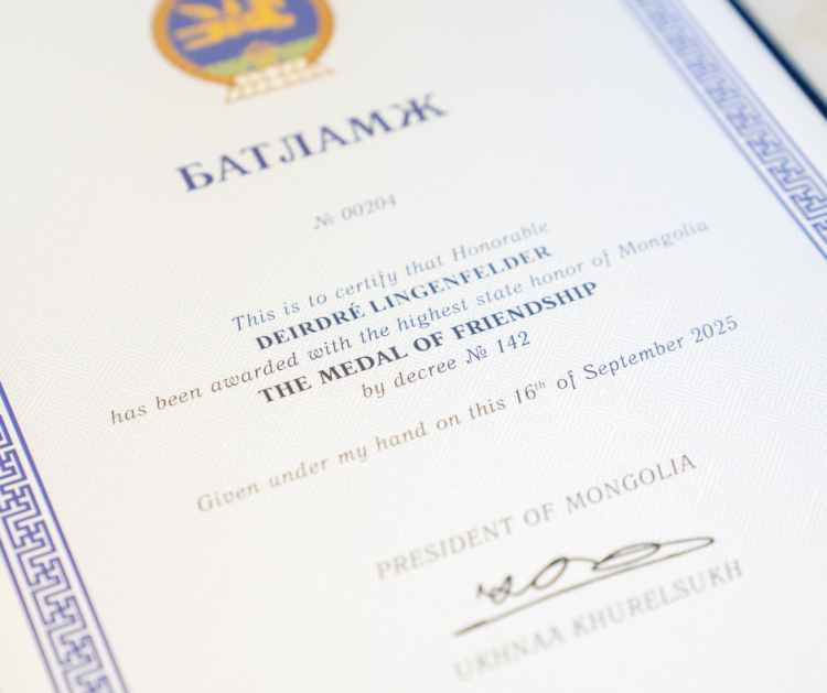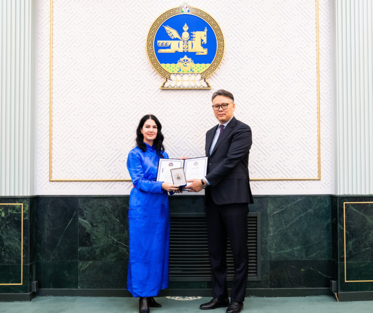 “Оюу толгой” компанийн Гүйцэтгэх захирал Дэйрдрэ Лингенфэлдер Монгол Улсын уул уурхайн салбарт оруулсан хувь нэмрийг үнэлэн “Найрамдал медаль”-аар шагналаа.