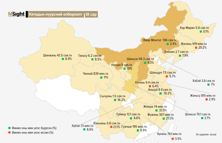Монгол Улстай хил залгаа Шинжань, Ганьсу, Өвөр Монголд нүүрсний олборлолтын хэмжээ өмнөх оны мөн үетэй харьцуулахад 2.5-8.5 хувиар буурсан байна. Харин олборлолт бусад газартай харьцуулахад өндөр байна. Тухайлбал Өвөр Монгол нийт есдүгээр сард хийгдсэн олборлолтын 1/4 эзэлжээ.