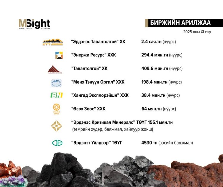 2025 оны 11 дүгээр сард Монголын хөрөнгийн биржээр 3.8 сая тонн уул уурхайн бүтээгдэхүүн арилжсан байна. Үүнээс