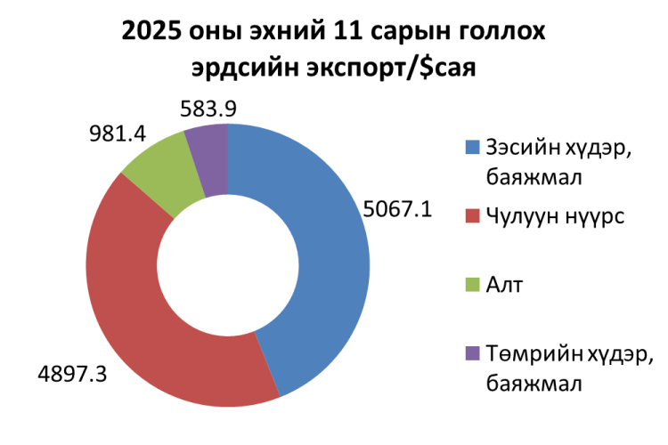 Монгол Улс 2025 оны эхний 11 сард 13.7 тэрбум ам.долларын экспорт хийсэн байна. Үүнээс 11.5 тэрбум ам.доллар буюу 84 хувийг зэсийн хүдэр, баяжмал, чулуун нүүрс, алт, төмрийн хүдэр, баяжмал гэсэн дөрвөн эрдсийн бүтээгдэхүүн бүрдүүлснийг Үндэсний статистикийн хорооноос мэдээллээ.