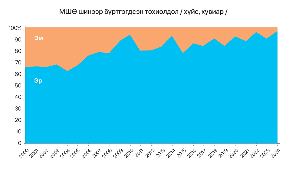 Шинээр бүртгэгдсэн МШӨ-ий тохиолдлыг хүйсээр ангилж шинжлэхэд 2000 онд шинээр бүртгэгдсэн МШӨ-ий 65.6 хувь нь эрэгтэйчүүд байсан бол 2024 онд 96.5 хувьд хүрсэн байна.