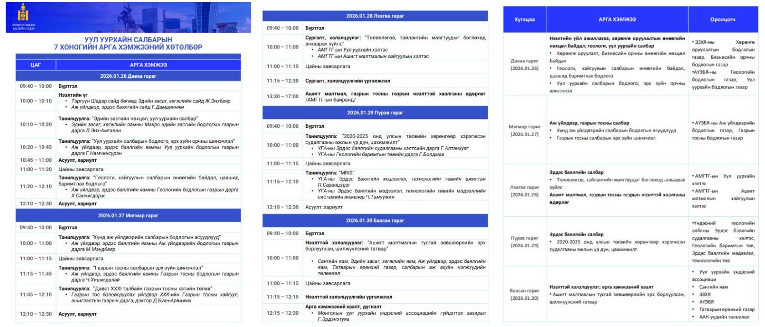 Нэгдүгээр сарын 26-30-нд үргэлжлэх "Уул уурхайн салбарын 7 хоног" үйл ажиллагааны хөтөлбөртэй танилцана уу.