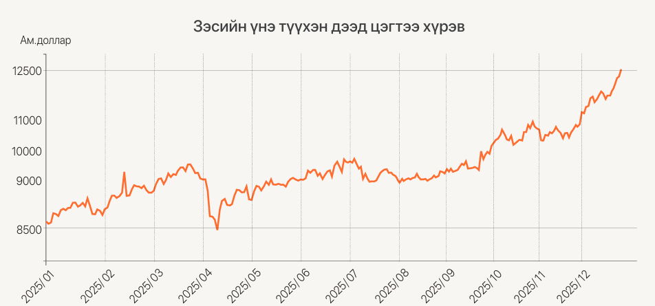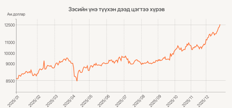 2025 онд зах зээл дээр алтны үнэ хамгийн өндөр цэгтээ хүрлээ. 12 дугаар сарын сүүлийн 7 хоногт 4,500 ам.долларт хүрснээр жилийн эхнээс бараг 70 орчим хувиар өсөөд байна. Алтны үнэ ийн өсөхөд үндсэн хоёр зүйл нөлөөллөө.