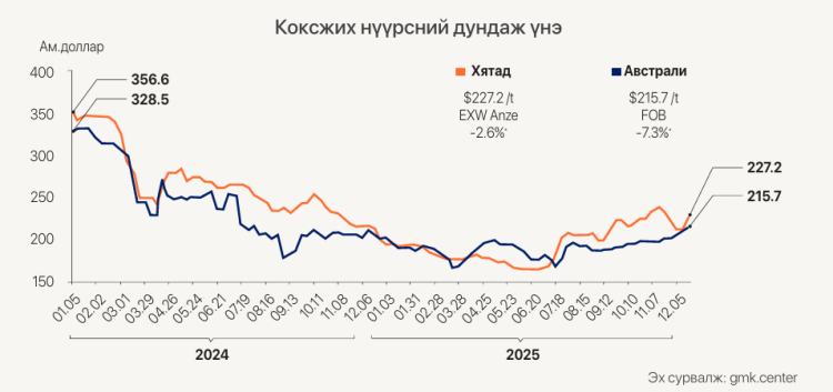 Зэс, алттай харьцуулахад нүүрс, төмрийн хүдэр зэрэг Хятадын эдийн засгаас хамааралтай түүхий эдийн үнэ бараг 50 хувиар буурсан нь 2025 оны нэг онцлог байлаа. Монгол Улсын экспорт, татварын орлогын цөмийг бүрдүүлдэг гэдэг утгаараа коксжих нүүрсний зах зээлийн өөрчлөлт хамгийн чухал. Коксжих нүүрсний хамгийн том хэрэглэгч, импортлогч Хятад улсын хувьд 2025 онд хэрэглээ-үйлдвэрлэл-импортдоо нэлээд том өөрчлөлт хийсэн гэхэд болно. Тус улс үл хөдлөх хөрөнгийн салбарын хямралаас улбаатай гангийн эрэлт, нийлүүлэлтийн тэнцвэрийг хадгалахыг зорьж байгаа.