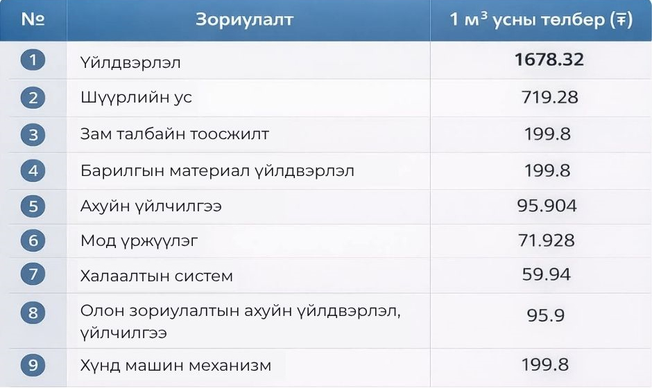 Усны тухай хуулийн 28.4-т зааснаар хоногт 100 м³ буюу түүнээс их ус ашиглах, эсвэл эрчим хүч, усан тээврийн зориулалтаар ус ашиглах бол Усны газраар дүгнэлт гаргуулдаг. Энэ дүгнэлт нь Засгийн газрын тогтоолоор тогтоосон ус ашиглалтын нормоор тооцогддог бөгөөд усны төрөл, зориулалтаас хамаарч тариф өөр өөр байна.