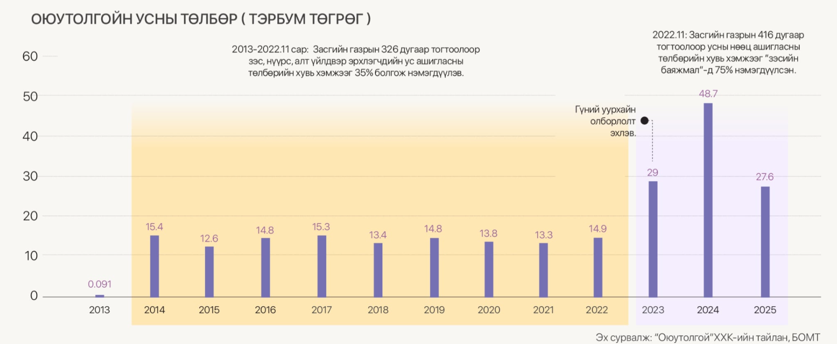 Засгийн газраас усны төлбөрийг нэмэгдүүлсэн нь гүний уурхай ашиглалтад орох мөчлөгтэй давхцаж байгааг графикаас харж болно. 2013 оноос хойш нийт 218 тэрбум төгрөг усны төлбөрт төлсөн нь Өмнөговь аймаг, Ханбогд сумын төсөвт орж, орон нутгийн хөгжлийг дэмжиж байна. Үүний ихэнх нь Өмнөговь аймгийн төсөвт, харин ахуй, угаалгын зориулалтаар ашигласан усны төлбөр нь Ханбогд сумын төсөвт ордог байна.