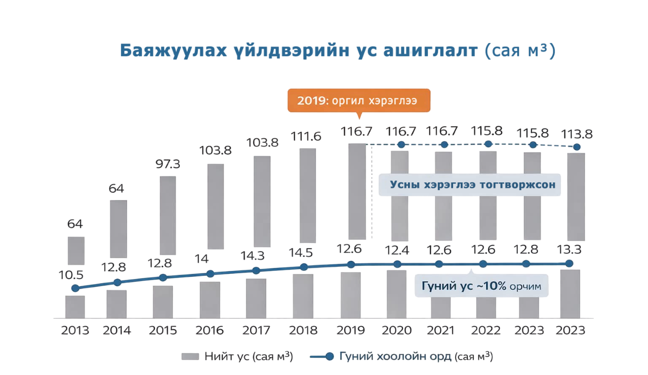 Баяжуулах үйлдвэр ашиглалтад ороод эхний таван жилд ус ашиглалтын хэмжээ өнөөгийн түвшинд тогтворжсон байна. Гүний хоолойн ордоос ашигласан 10 сая м³ усны хэмжээ 2-4 сая м³-аар нэмэгдсэн бөгөөд энэ түвшин хэвээр хадгалагдаж байна. Өнөөдрийн байдлаар Оюу толгойн үйлдвэрлэлийн усны дахин ашиглалт 90 хувьд ойртсон бөгөөд “Zero discharge” буюу “Байгальд ус хаяхгүй” зарчмыг баримталж ажиллаж байгаа аж.